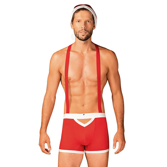 O conjunto de Natal, Mr. Claus da Obsessive, contém calções com suspensórios e chapéu.