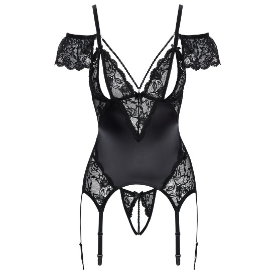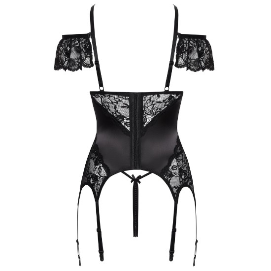 O conjunto de cuecas fio dental com espartilho e virilha aberta da Cottelli LINGERIE é feito de material preto com brilho acetinado combinado com renda delicada e pequenos laços decorativos.