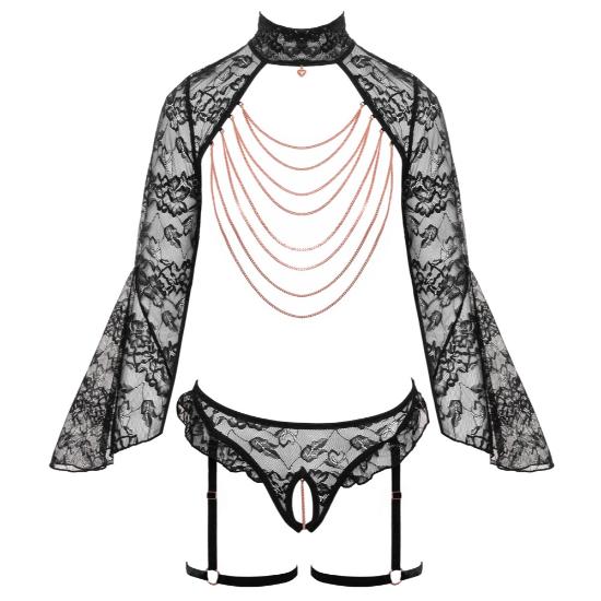 Inúmeras correntes adornam a parte frontal aberta e acariciam os seios nus. Todas as correntes podem ser removidas. As cuecas-liga são extremamente sedutoras devido aos delicados folhos em redor das cavas altas das pernas e à corrente removível e estimulante sobre a zona aberta da virilha. As correias elásticas da liga e das coxas são feitas de veludo delicado, podendo ser ajustadas e removidas.