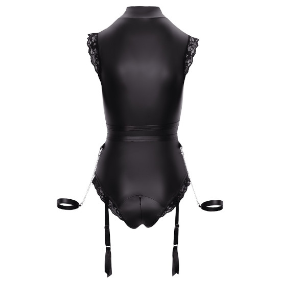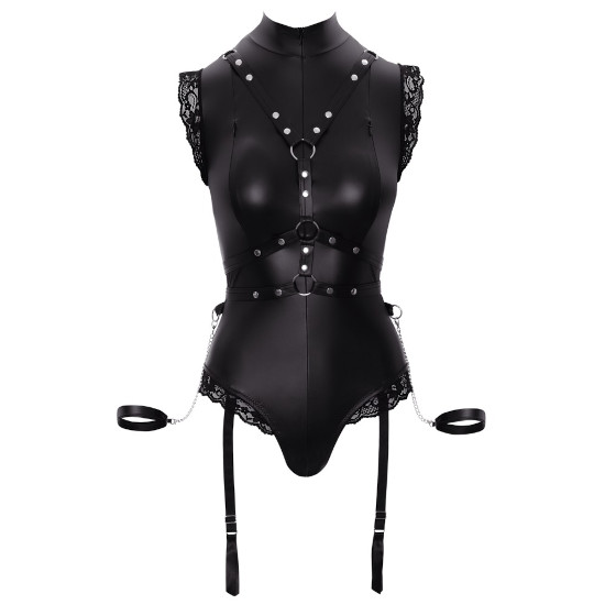 O arnês é decorado com tachas e também tem uma algema em uma corrente em cada lado.