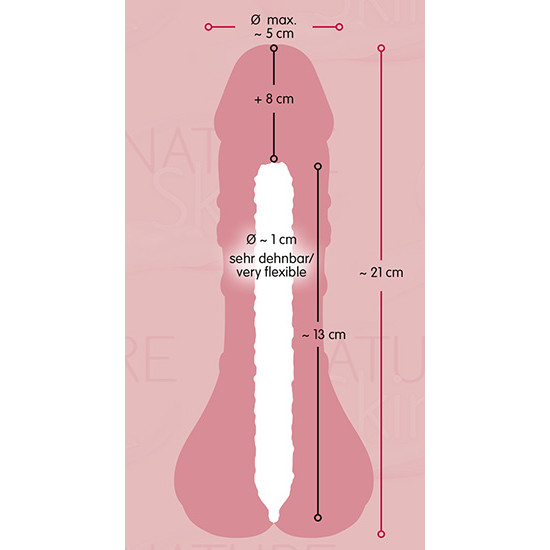 Comprimento completo 21cm, profundidade de inserção 13cm, Ø exterior 4,2cm a 5cm, interior Ø 1 cm, extremamente flexível.