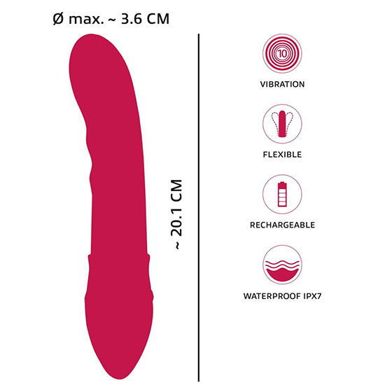 Recarregável – inclui um cabo USB. Comprimento total: 20,1 cm, Ø máx.: 3,6 cm. Peso: 139 g. Silicone, PU, ABS.