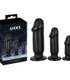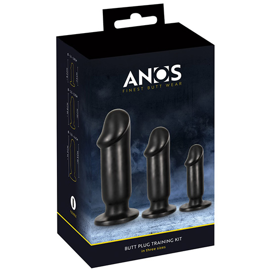 Conjunto Butt Plug da ANOS que inclui 3 plugs anais com diferentes tamanhos e pesos para estimulação prazerosa ou alongamento e treinamento do anús.