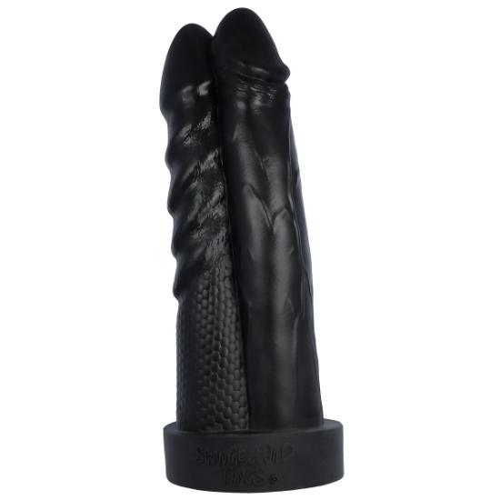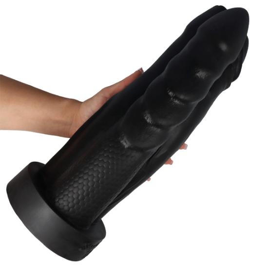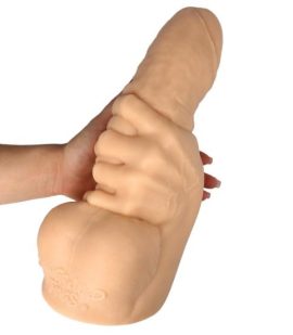 Este dildotem uma forma arredondada, imitando uma forma realista com ranhuras ao longo do seu comprimento.