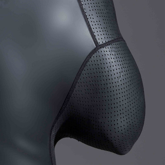 O neopreno Smoothskin foi perfurado para proporcionar mais respirabilidade e há uma luva interna para permitir um jogo de escravidão mais intenso com uma sensação de camisa de força.