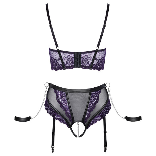 Conjunto: sutiã de um quarto de copa, cueca suspensório sem virilha e 2 algemas