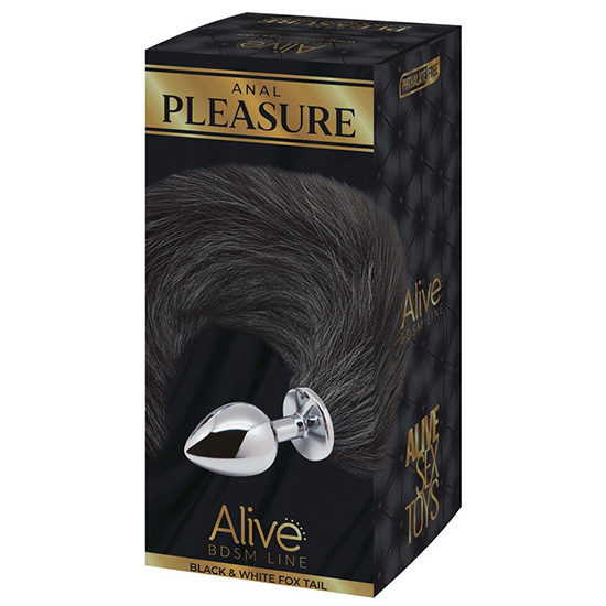 O plug anal em forma de cone Black & White Fox Tail S da Alive tem uma cauda longa e fofa feita de pelo sintético.