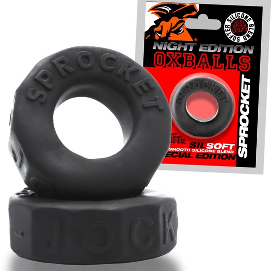 O novo anel peniano SPROCKET NIGHT EDITION da OXBALLS é fabricado na nossa mistura de silicone SILSOFT e borracha, com uma cor preta suave e aveludada.