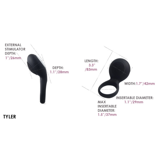 Tyler é um anel vibratório concebido para casais com um estilo de vida íntimo e aventureiro. Tyler não só ajuda a prolongar a resistência do homem, como também estimula o clitóris da mulher com uma almofada vibratória macia e contornada, feita de nódulos de silicone seguros para o corpo, que intensifica a estimulação.