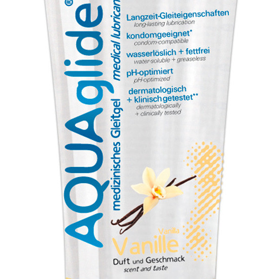 Lubrificante vegano à base de água AQUAglide Baunilha da Joydivision, com aroma e sabor natural de framboesa e ótimas propriedades deslizantes de longa duração.
