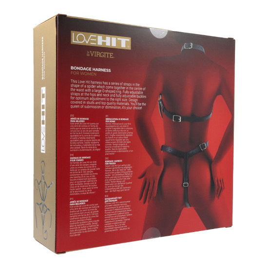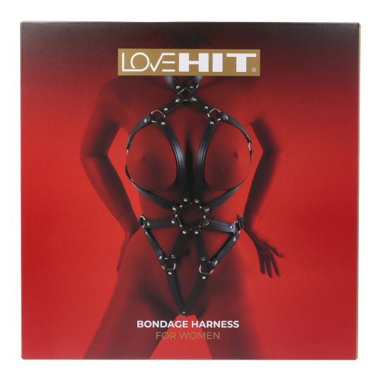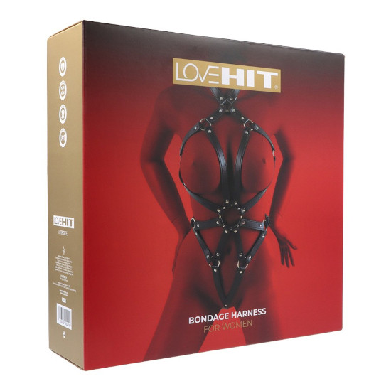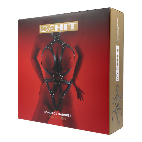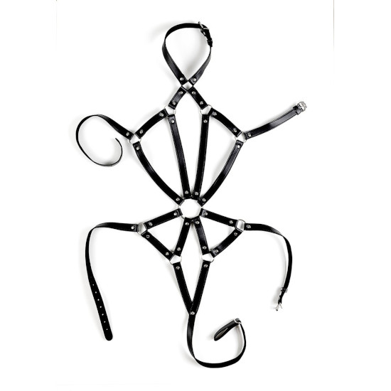 Arnês corporal feminino totalmente ajustável feito de couro vegano.