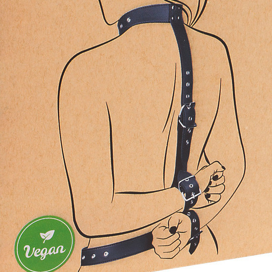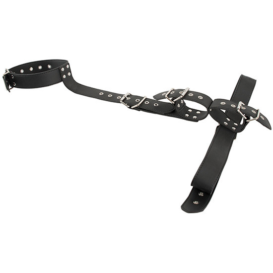 Arnês de restrição preto com gargantilha, cinto para cintura e algemas.