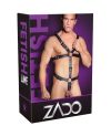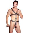 Arnês feito de tiras de couro pretas com tachas e anéis de conexão de aço.