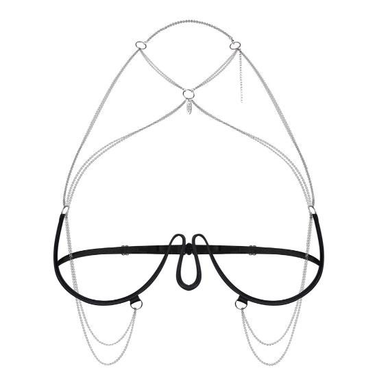 Joias e correntes adicionais decoram o decote e balançam abaixo dos seios.