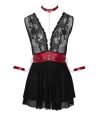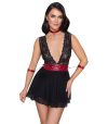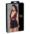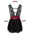 O babydoll curto e preto da Cottelli BONDAGE é feito de delicada renda (topo) e elegante powernet (saia) com uma inserção contrastante feita de material vermelho fosco que destaca a área da cintura.