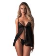 O conjunto Blomentis da Obsessive contém um babydoll muito curto e largo e um fio feito de material preto transparente.