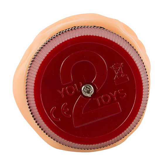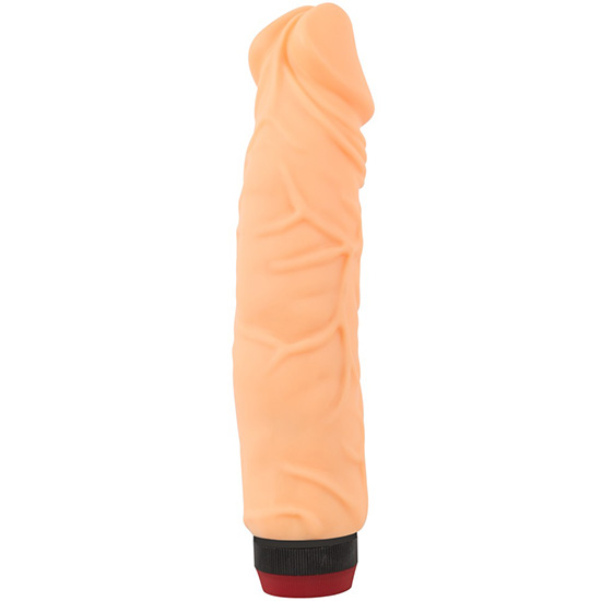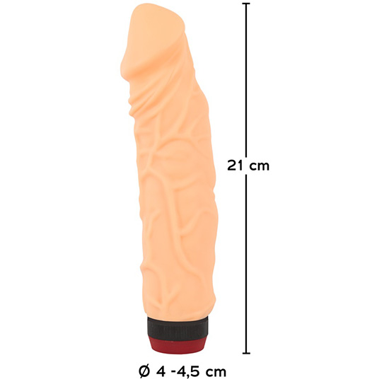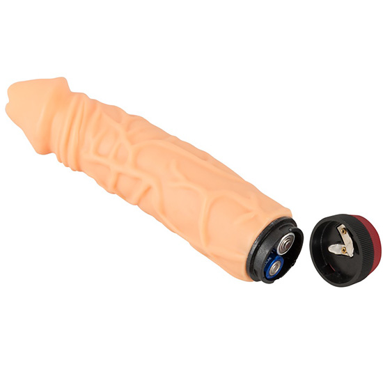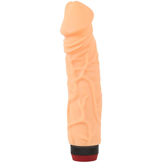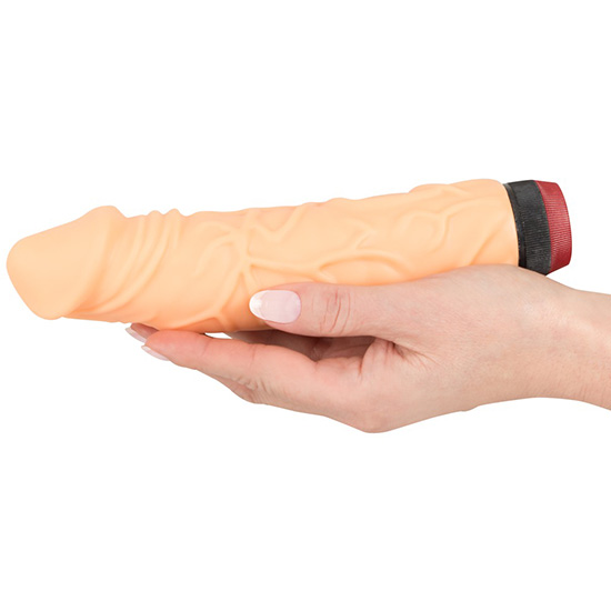 Vibrador de aspeto realístico cor carne com veias e glande saliente.