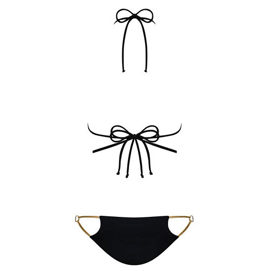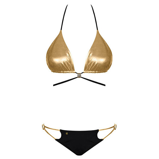 O biquíni Goldivia da linha Swimwear 2022 da Obsessive tem uma cor dourada brilhante e também possui partes pretas contrastantes extravagantes.
