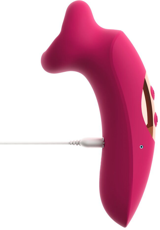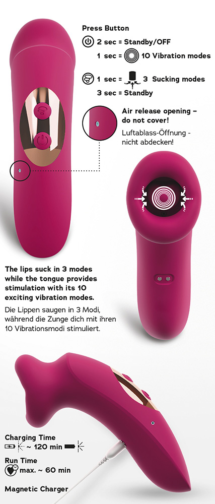 Com boca de sucção e língua vibratória. Estimula o clitóris e outras zonas erógenas.
