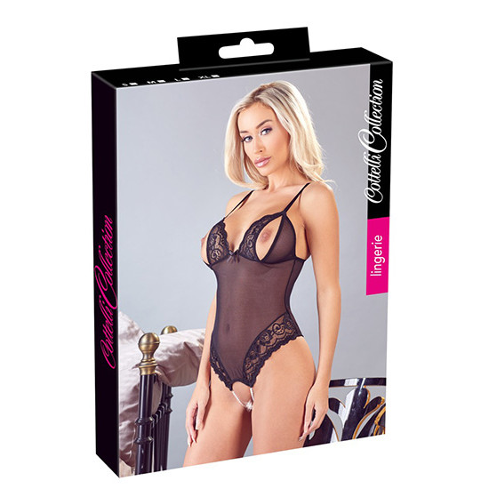 Body em tecido preto/transparente com detalhes bordados florais na parte dos seios e ancas e é unido por entre as pernas por 2 fileiras de pérolas elegantes.