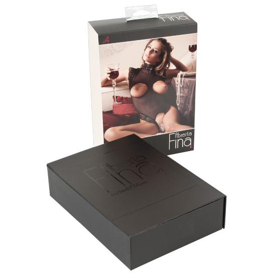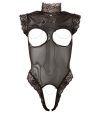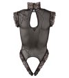 Body preto transparente com acabamentos em renda nas mangas, gola (2 botões atrás) e à volta das pernas.
