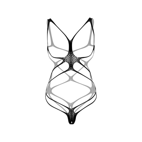 Não deixe nada à imaginação com este body ultra elástico e de alças finas, com copas abertas, detalhes em rede, virilhas abertas e costas com tanga.