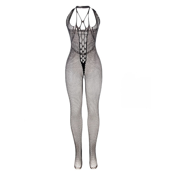 - Estilo: Body longo de rede preta com alças no peito e nas costas.