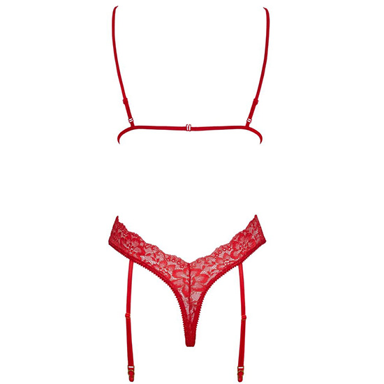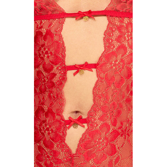 Feito inteiramente em renda vermelha delicada, com detalhes dourados que une o decote profundo.