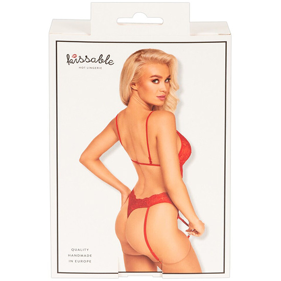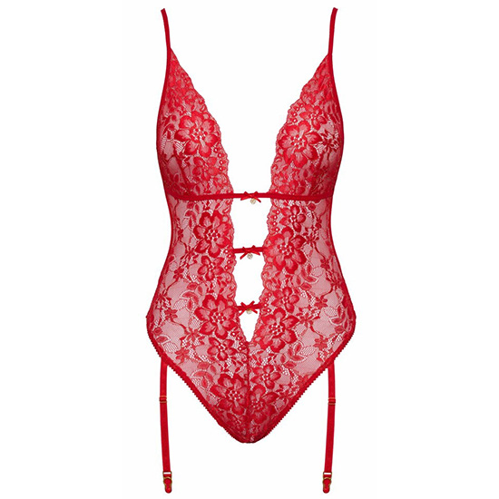 Body suspensório sedutor da Kissable, totalmente feito em renda vermelha fina com detalhes dourados.