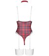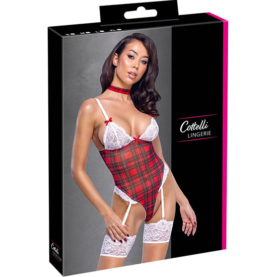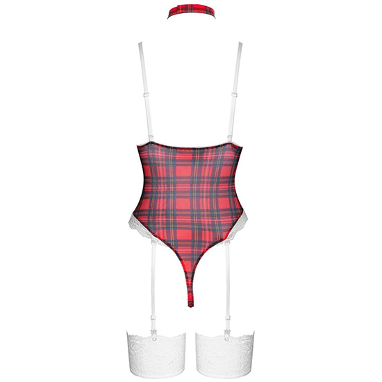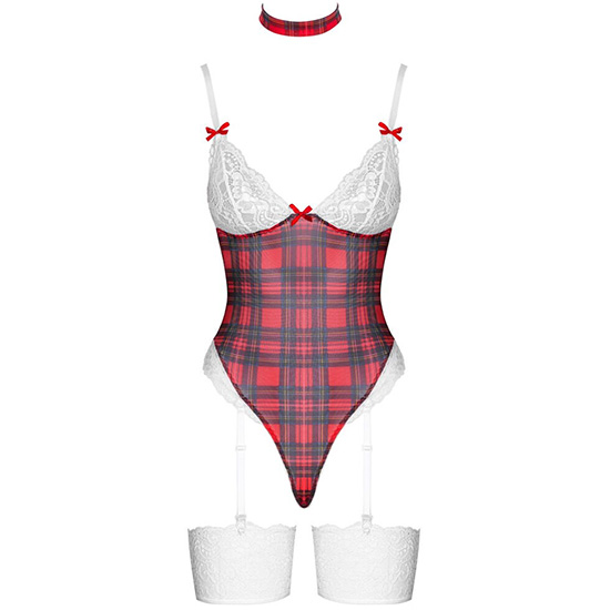 Conjunto body-tanga e gargantilha, num visual xadrez alegre vermelho, combinado com renda branca e decorado com laços.