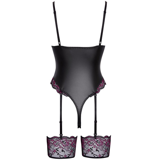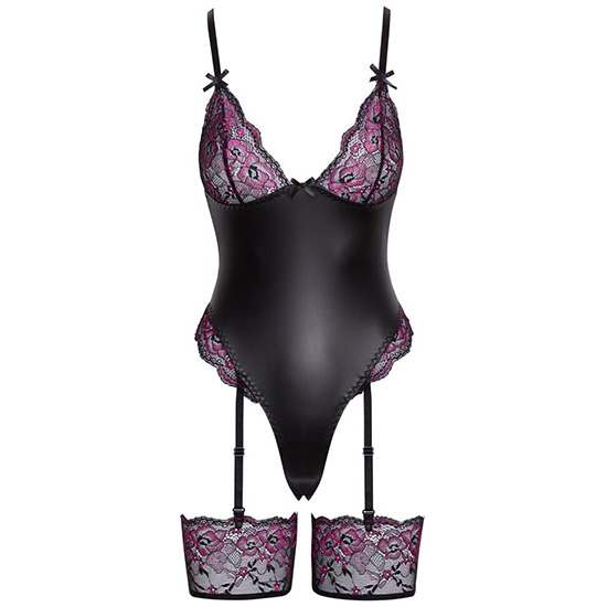 Body-tanga num tecido acetinado preto, com detalhes em renda bordada púrpura/preta.