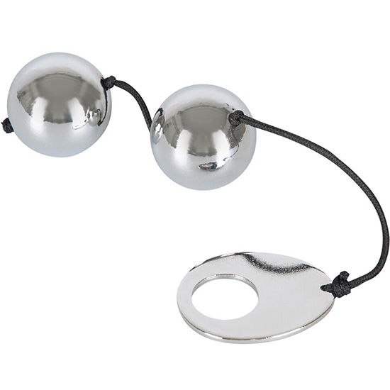 2 bolas pesadas de metal prateado polido com anel de retração.
