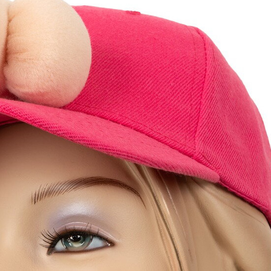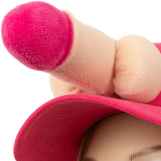 boné de basebol rosa tem uma pilinha e testículos de peluche macios e aveludados, chamativos e numa cor contrastante. O pénis e os testículos estão acima da viseira.