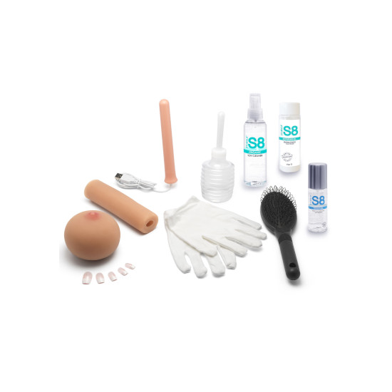 Incluído no pacote estão dois conjuntos de lingerie impertinentes, desinfetante de brinquedos S8 Quality, lubrificante S8 Silky, pó S8 Renewal, luvas de algodão branco para mover/manusear a boneca, um conjunto de unhas de substituição, uma varinha de aquecimento USB, um irrigador de limpeza, um escova de cabelo e extensas instruções de cuidados.