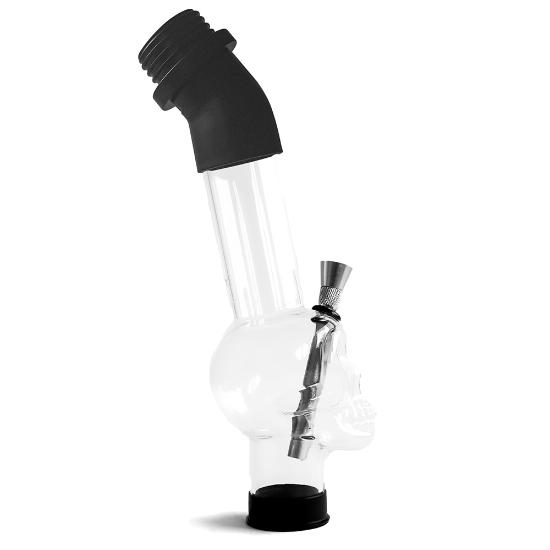 Este bongo pode ser utilizado com e sem água e possui um pequeno orifício perfurado na parte traseira do tubo de plástico, em direção à abertura da máscara de gás.