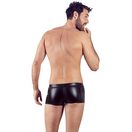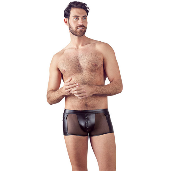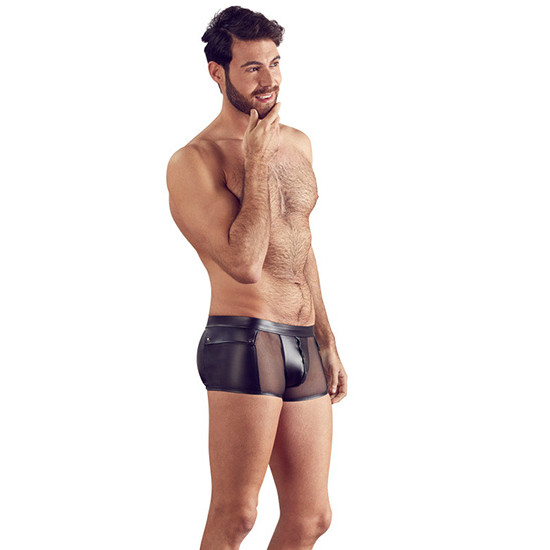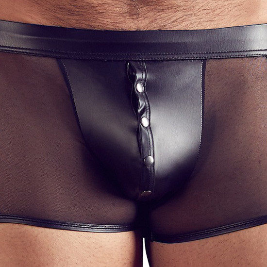Boxers justos em tecido acetinado preto combinado com rede fina preta/transparente. Abre à frente com molas de pressão.