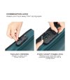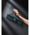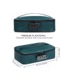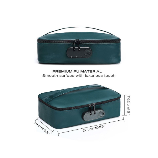 A caixa possui um fecho de correr duplo que pode ser fechado por uma fechadura de combinação integrada.