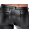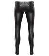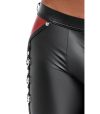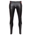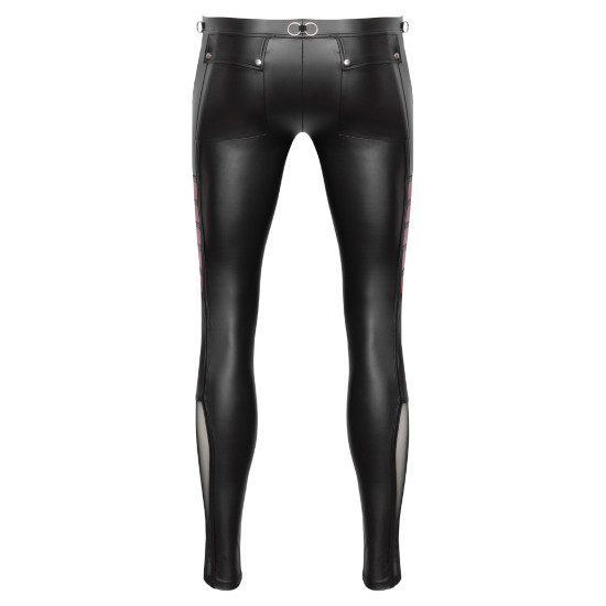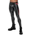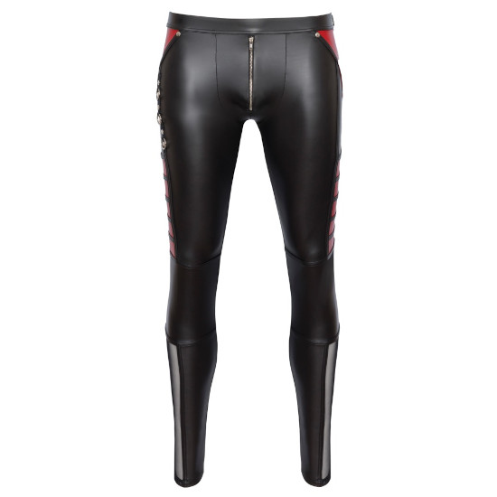 Calça justa da NEK em look preto fosco com contrastes em vermelho e detalhes marcantes de rebites e anéis.