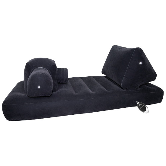 Inclui 1 cama insuflável com encosto, 1 peça insuflável com propulsor e apoio confortável para as pernas, 1 unidade de controlo recarregável, 1 bomba de ar recarregável, 1 cabo USB-C, 1 comando à distância incluindo bateria (23A), 2 vibradores.