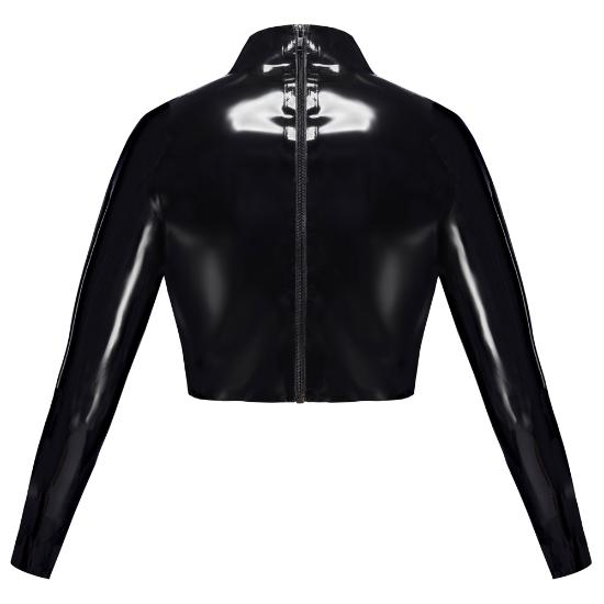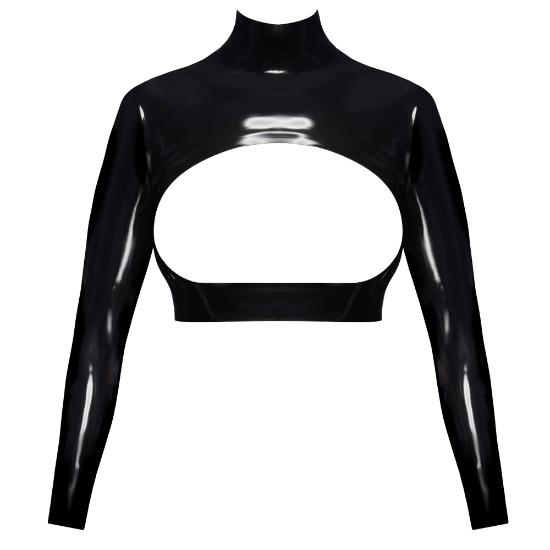O top cropped da LateX é feito de látex preto natural (espessura de 0,35 mm) e conta ainda com um grande recorte frontal para destacar os seios de forma deslumbrante.