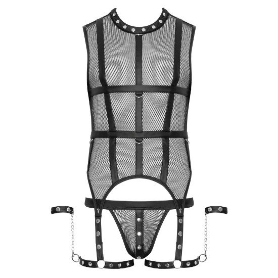 Este conjunto preto da Svenjoyment BONDAGE contém uma camisola de rede sem mangas com arnês para as coxas, um jock de rede e 2 algemas.