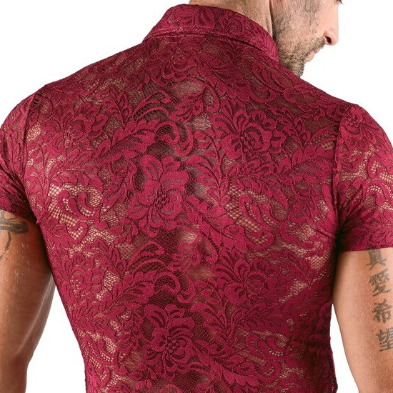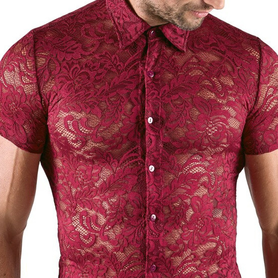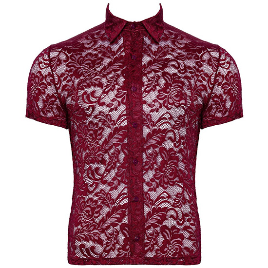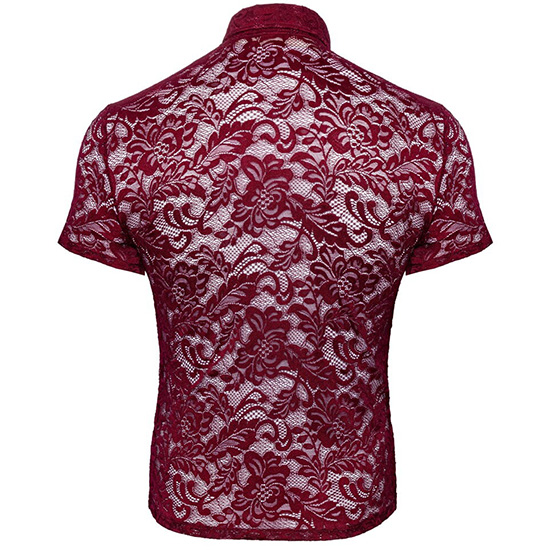 A camisa de destaque da Svenjoyment tem mangas curtas, gola e uma fila de botões que vão até à frente. Ela é feita inteiramente de renda floral vermelha escura, que é macia e elástica para um ajuste muito confortável.