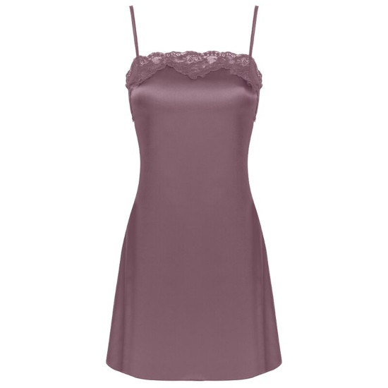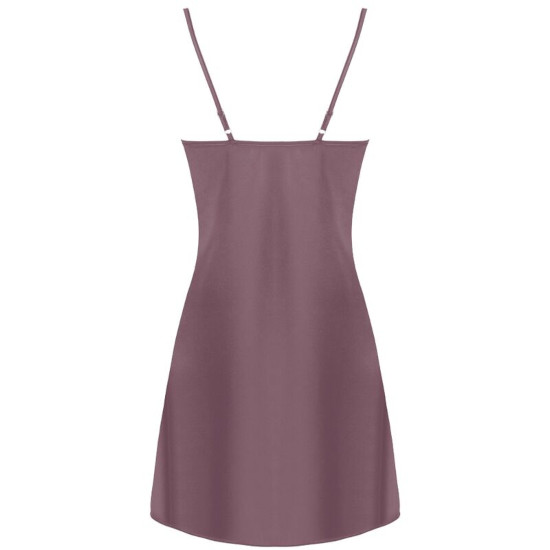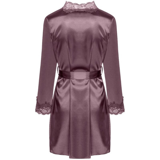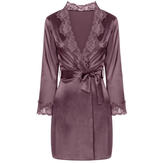 Um conjunto de lingerie excepcionalmente lindo feito de cetim violeta brilhante, um roupão com camisola que chega até o meio da coxa.