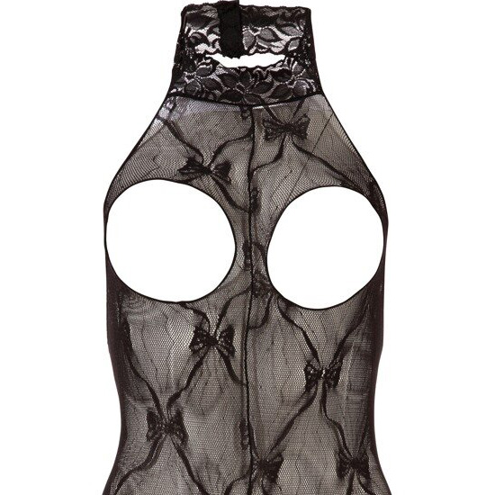 bodystocking preto com busto aberto, confecionado em renda lisa, efeito cruzado. Segura-se no pescoço com fecho de velcro.