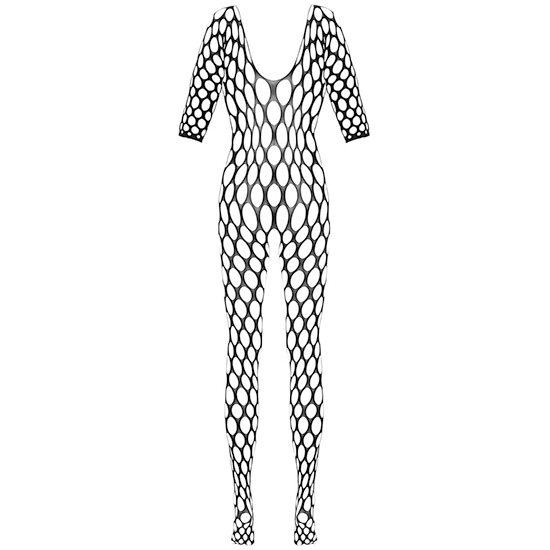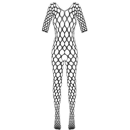 O macacão preto, sem virilha, da FANTASY by Cottelli Collection tem mangas compridas e um design com furos reveladores.