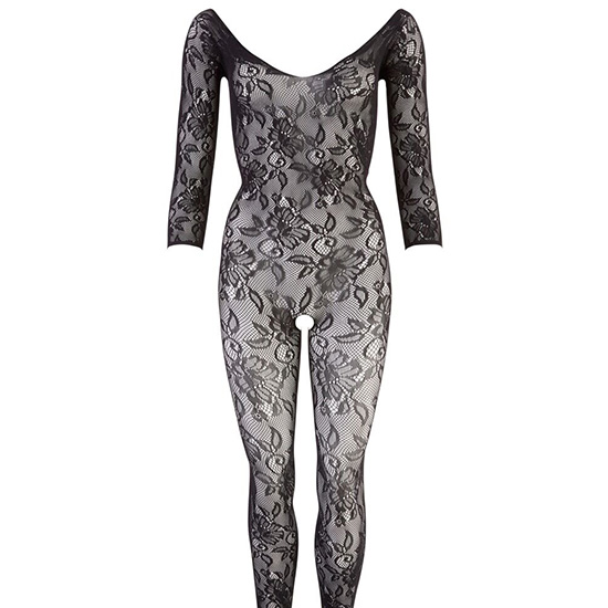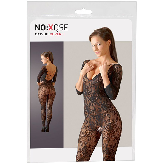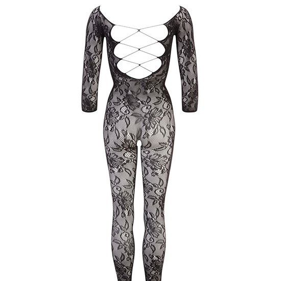 Lindo bodysuit feito de renda preta floral. Com mangas 3/4, costas descobertas e parte dos pés. Com fio cruzado decorativo na parte de trás do macacão. Sem virilha. Sem costura.