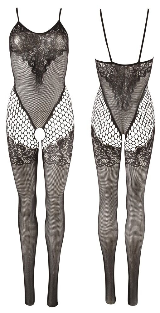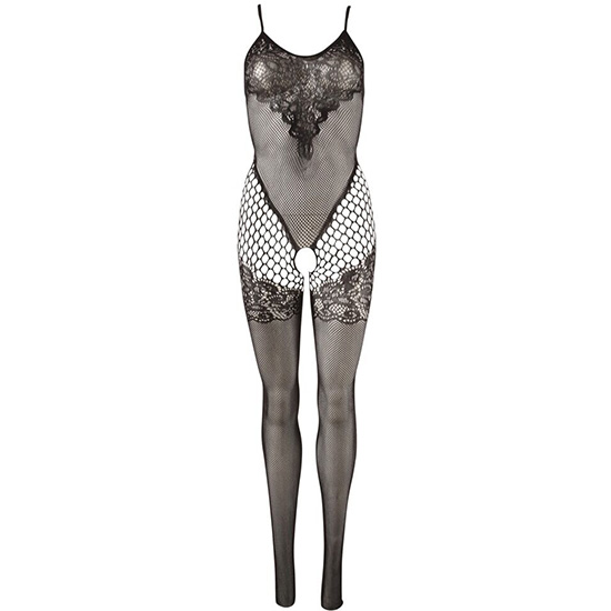 Macacão preto com padrão rendado no busto, nas coxas e na virilha.