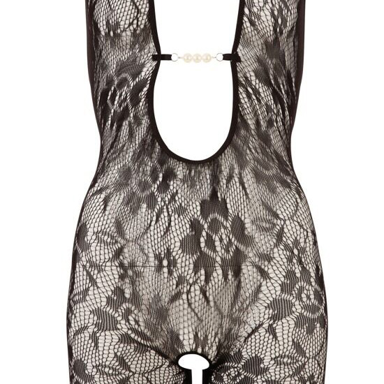 Feito de material de rede delicado, com decote halter Pérolas na zona do decote. Convidativamente aberto na zona da virilha. Com uma parte do pé.