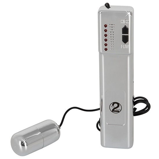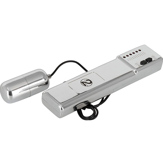 Ovo vibratório prateado com controlo remoto e 6 níveis diferentes de potência.