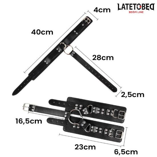 Desfrute de ser o dono do poder ou o submisso com estas algemas que possuem uma coleira ajustável com fivela presa a uma tira, também ajustável por fivela, e algemas de pulso entrelaçadas.